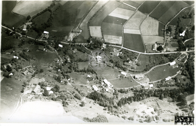 Fotografie - Letecký snímek- dolní konec obce-rozptýlené zastavění obce kolem komunikace