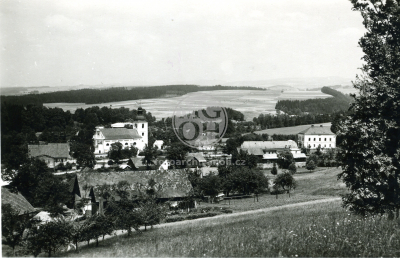 Název fotky: Fotografie - Celkový pohled na střed obce s kostelem a školou