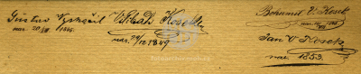 Skupina občanů v zahradě p. Vyskočila v České Třebové: Gustav Vyskočil *1845, Vilibald Kosek *1849, Bohumil V. Kosek *1848, Jan V. Kosek *1853