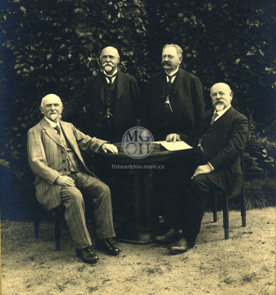 Fotografie - Skupina občanů v zahradě p. Vyskočila v České Třebové: Gustav Vyskočil *1845, Vilibald Kosek *1849, Bohumil V. Kosek *1848, Jan V. Kosek *1853