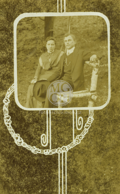 2008212/4 Manželé na březové lavičce (úprava kompozice art deco). 8,8 x 13,8.