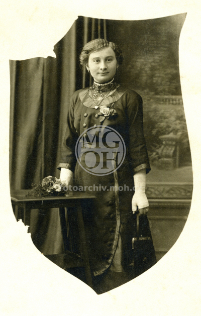 2008212/5 Žena v šatech s límečkem a bezprstovými rukavicemi. 8,8 x 14